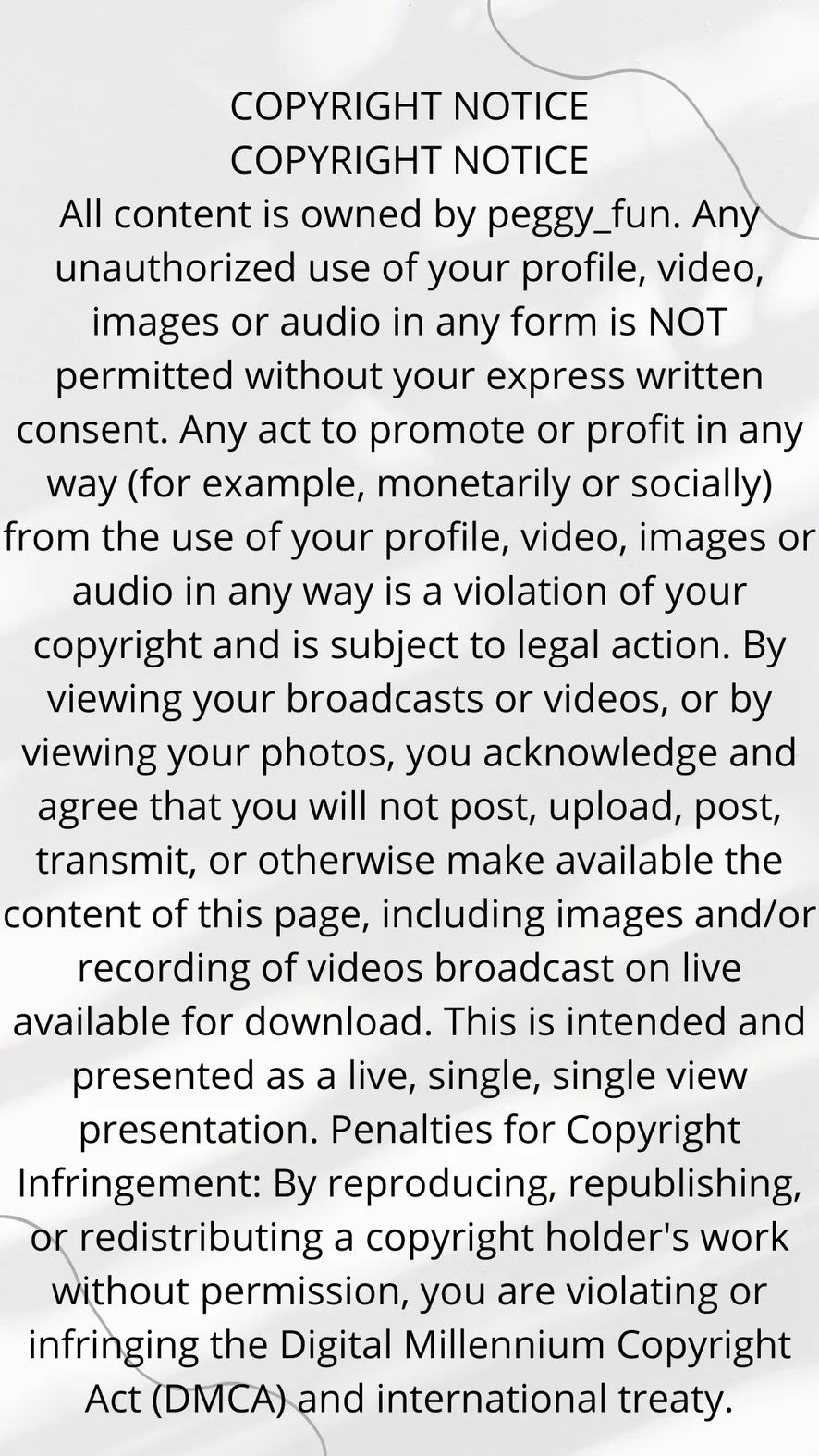 All content is owned by peggy_fun. Any unauthorized use of your profile, video, images or audio in any form is NOT permitted without your express written consent. Any act to promote or profit in any way (for example, monetarily or socially) from the use of your profile, video, images or audio in anyof your copyright and is subject to legal action. By viewing your broadcasts or videos, or by viewing your photos, you acknowledge and agree that you will not post, upload, post, transmit, or otherwise make available the content of this page, including images and/or recording of videos broadcast on live available for download. This is intended and presented as a live, single, single view presentation. Penalties for Copyright Infringement: By reproducing, republishing, or redistributing a copyright holder's work without permission, you are violating or infringing the Digital Millennium Copyright Act (DMCA) and international treaty.